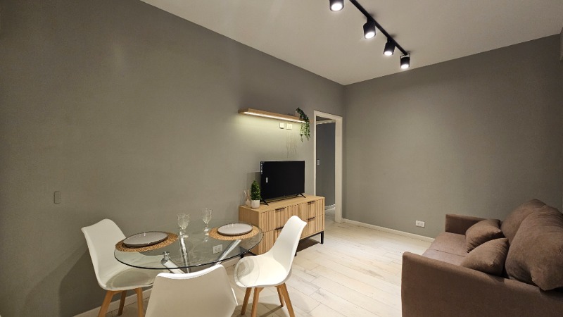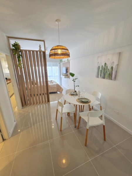 Ambiente dividido con amplio ventanal de piso a techo súper luminoso, cama sommier a estrenar de dos plazas, resplado de cama con mesas de luz incorporadas, mesa con 4 sillas a estrenar, rac con TV Smart 32 pulgadas nuevo, placa caloventor nueva, plantas, acolchado y decoración.