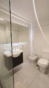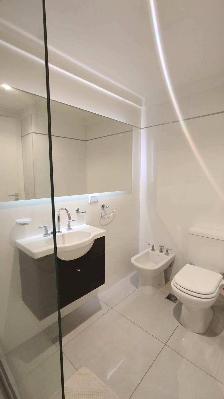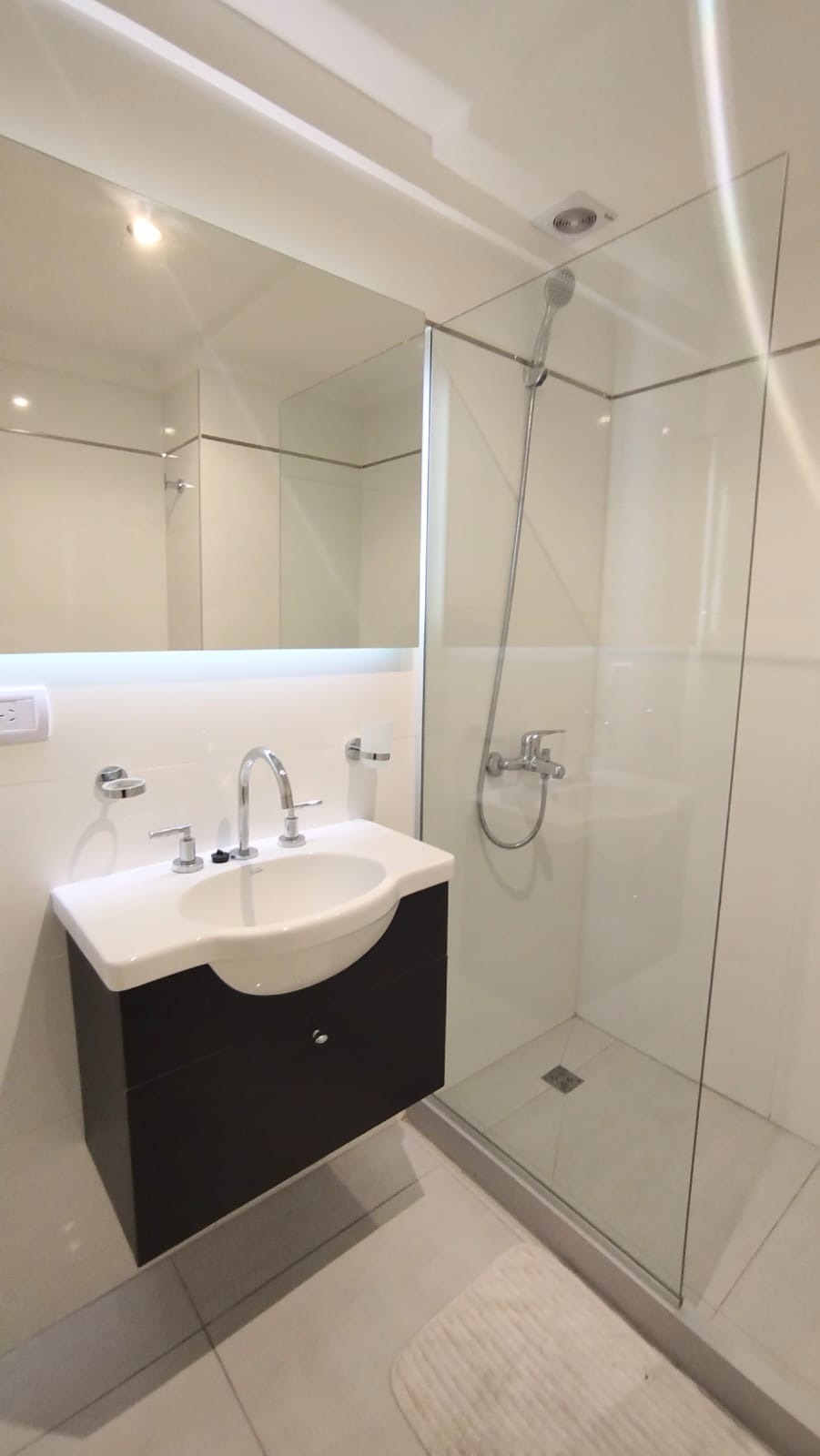 COMPLETO CON MAMPARA, VANITORY A MEDIDA, ESPEJO LED, Y PARED DECORADA EN PORCELANATO ESPAÑOL