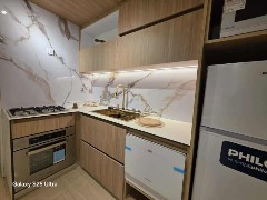 La cocina está equipada con muebles a medida, calefón, heladera, microondas, lavavajillas, horno y anafe, todo a estrenar.