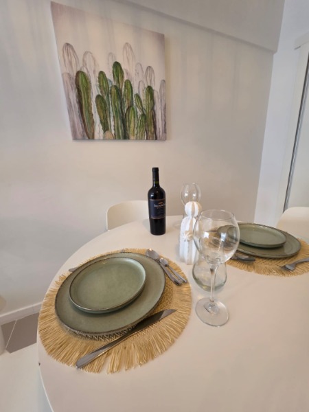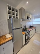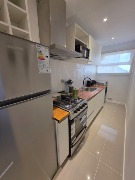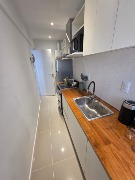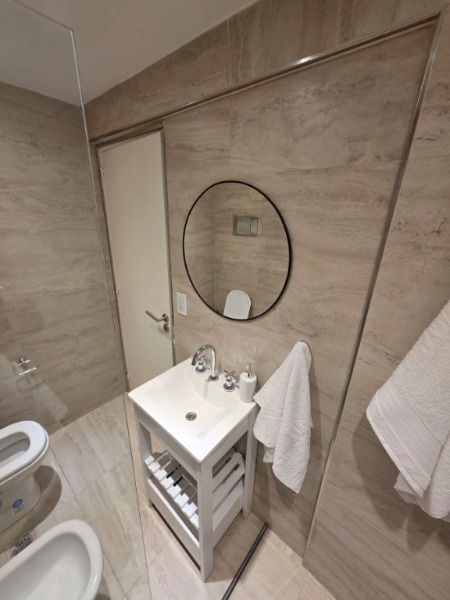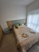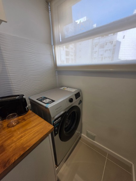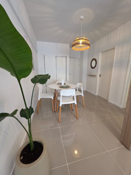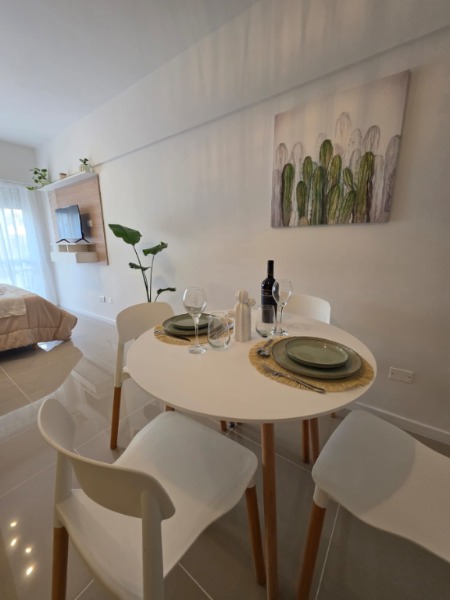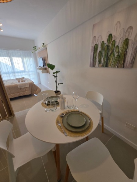 Ambiente dividido con amplio ventanal de piso a techo súper luminoso, cama sommier a estrenar de dos plazas, resplado de cama con mesas de luz incorporadas, mesa con 4 sillas a estrenar, rac con TV Smart 32 pulgadas nuevo, placa caloventor nueva, plantas, acolchado y decoración.