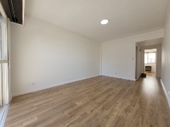 Habitación con pisos de parquet plastificado y amplio placard a medida.