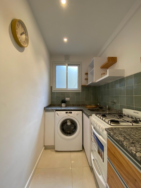 Departamento de dos ambientes al contra-frente, muy luminoso. Consta de living comedor al contra-frente con ventana, cocina separada con ventilación natural. Tiene un dormitorio al contra-frente con ventana, baño completo con ducha, calefacción por tiro balanceado, totalmente amoblado con detalles de calidad.
